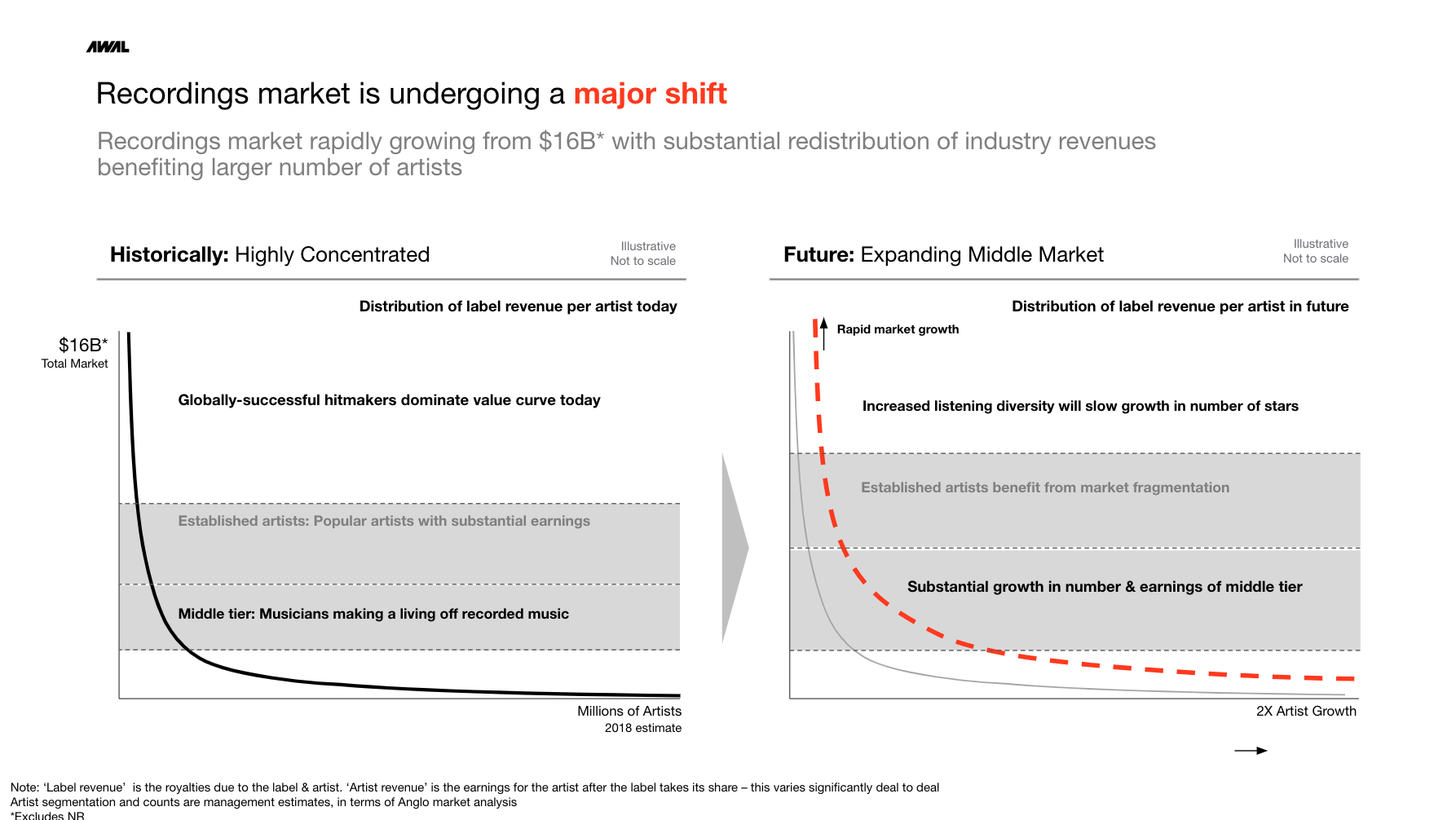 Being a niche star signed to a label is tough because most of the economics go to the label and you are beholden to the marketing decisions as the copyright owners. As a niche star with AWAL Recordings, you retain decision making power and most of the economics, and since you own your copyrights you have the option to sell them in the future (like an entrepreneur exiting their startup).