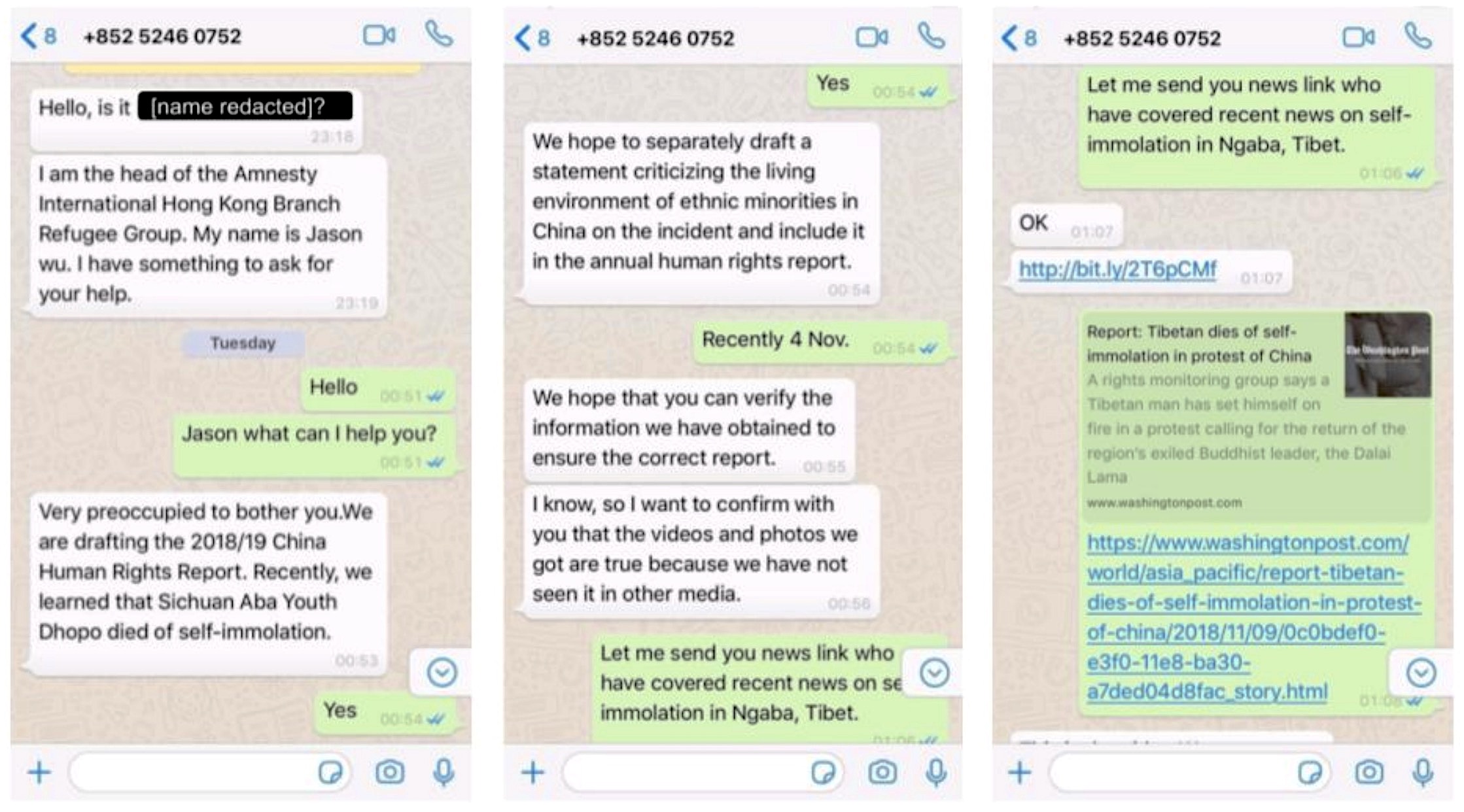 In its new research out Tuesday and shared with TechCrunch, Citizen Lab said a number of Tibetan victims were targeted with malicious links sent in WhatsApp messages by individuals purporting to work for Amnesty International and The New York Times. The researchers obtained some of those WhatsApp messages from TibCERT, a Tibetan coalition for sharing threat intelligence, and found each message was designed to trick each target into clicking the link containing the exploit. The links were disguised using a link-shortening service, allowing the attackers to mask the full web address but also gain insight into how many people clicked on a link and when.