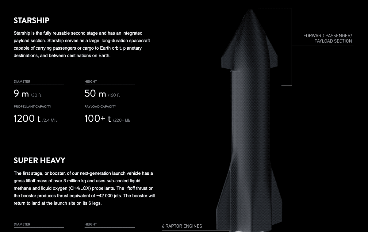 After CEO Elon Musk shared new details about its in-development Starship spacecraft on Saturday, SpaceX has updated its website with a new section dedicated to the fully reusable cargo and passenger vehicle. The new Starship website also provides a bunch of info about Super Heavy, the first-stage booster that will propel Starship to orbital altitudes and beyond.