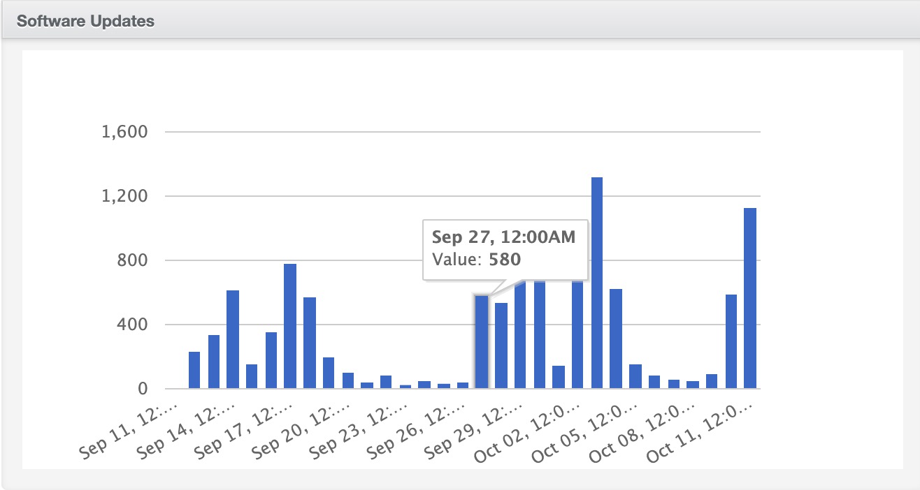 TezLab shared the data set below that shows the ebb and flow of Tesla’s software updates. The X axis shows the date (of every other bar) and a timestamp of midnight. (Because this is a screenshot, you can’t toggle over it to see the time.)