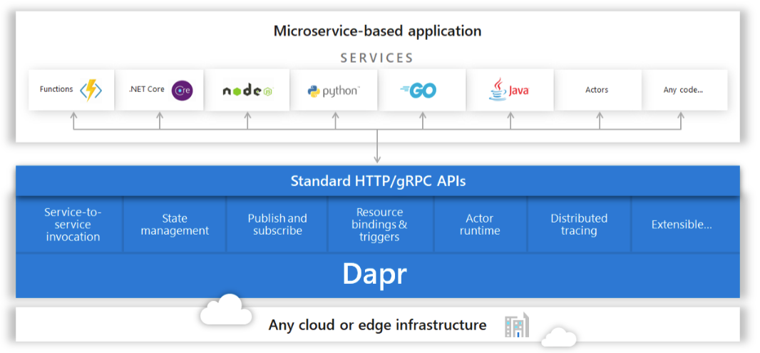 Dapr abstracts a lot of this away and provides the building blocks (which can be accessed by HTTP or gRPC APIs) that encode best practices for building these distributed services.