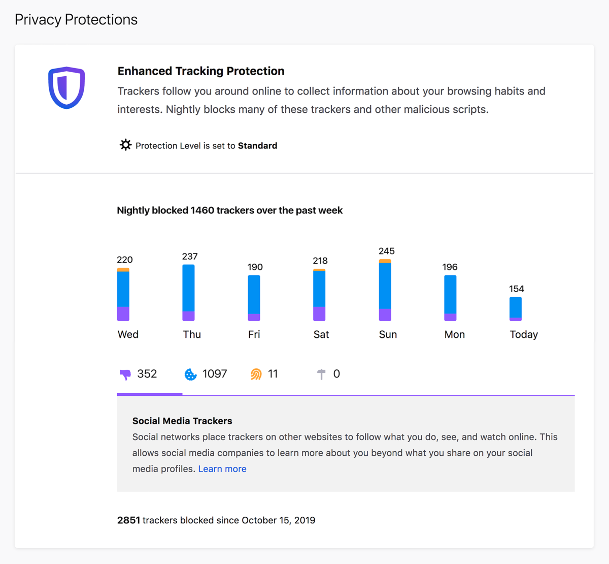 Mozilla today announced that its Enhanced Tracking Protection feature for Firefox, which launched in July (and became the default in September), has now blocked a total of more than 450 billion third-party tracking requests from the thousands of companies that try to track you as you browse the web. That’s a big number, but with today’s launch of Firefox 70, Mozilla is also giving you a personalized dashboard that tells you how often Firefox blocked third-party cookies, social media trackers, fingerprinting tools and cryptominers.
