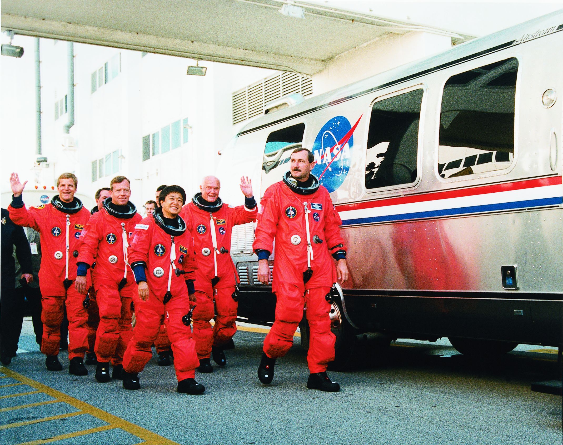 The Astrovan II holds up to eight passengers (compete with flight suits) and is a custom version of the Airstream Atlas Touring Coach that was hand-built in Jackson Center, Ohio. As you can see, they opted for a minimalist, sci-fi stainless steel look on the inside, with large, comfy-looking chairs that should provide a smooth ride before the considerably rockier one the crew will experience strapped to a massive, powerful rocket en route to the International Space Station.