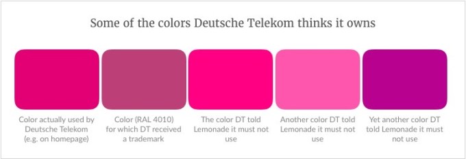 T-Mobile’s specific form of magenta that it has trademarked for its brand is RAL 4010, a color that is not exactly the same as Lemonade’s, Schreiber said. T-Mobile has been going after a number of companies using colors close to this as well, a process Lemonade is now charting as it gears up for its legal fight: