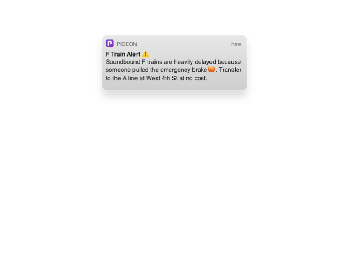 Similar to Waze, where users establish profiles and communicate with friends, Pigeon offers a social component. Users can post with both comments and images not only about delays, but also other transit happenings. These reports are then shared along a rider’s route in an activity feed.