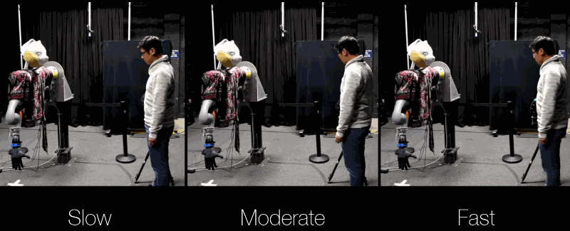 So the robot arm in this case (attached to an anthropomorphic cat torso) moves at a normal human speed. But there’s also the question of when it should reach out. After all, it takes us humans a second to realize that someone is handing something to us, then to reach out and grab it. A computer vision system might be able to track an object and send the hand after it more quickly, but it might feel strange.