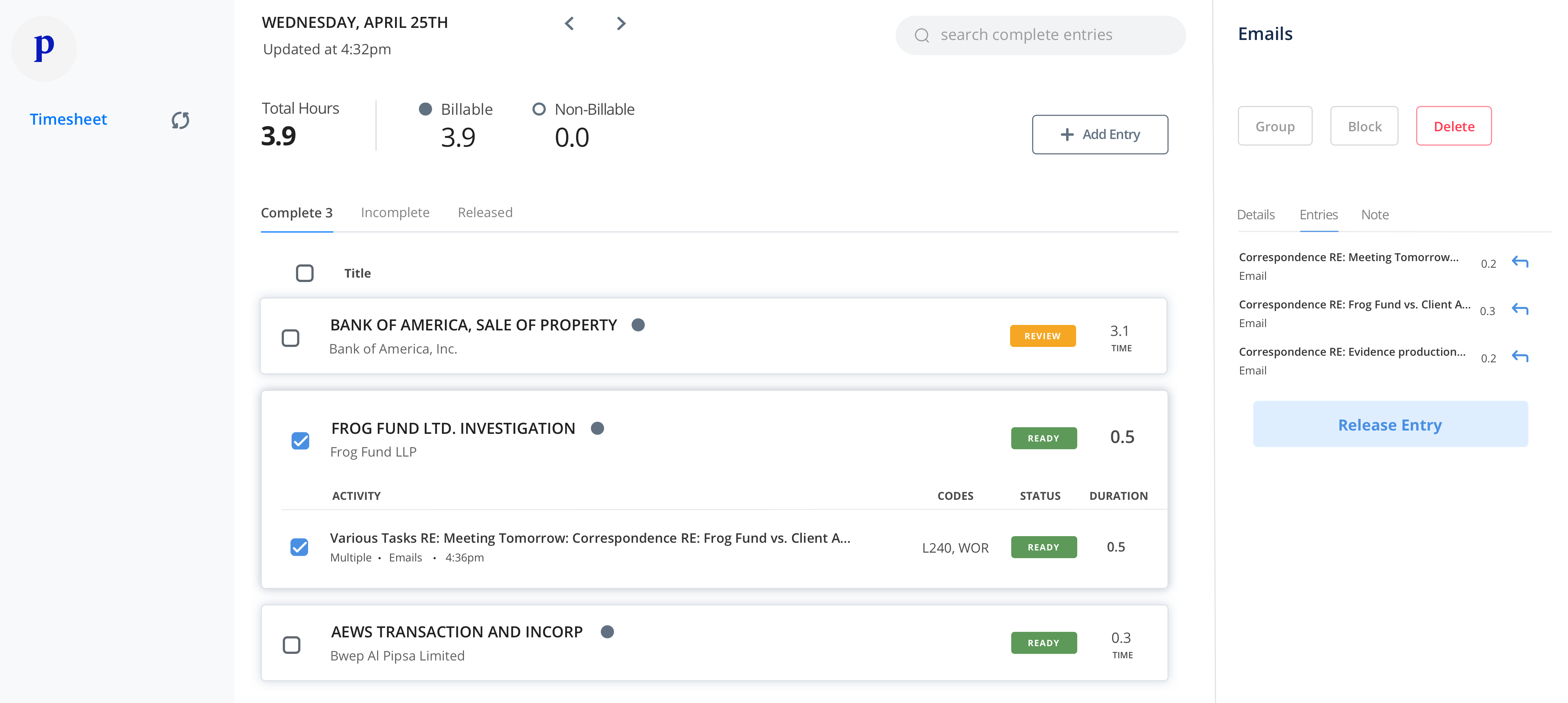 Ping goes a big step further. It uses AI and machine learning to figure out whether an activity is billable, for which client, a description of the activity and its codification beyond just how long it lasted. Instead of merely filling in the minutes, it completes all the logs automatically, with entries like “Writing up a deposition – Jenkins Case – 18 minutes.” Then it presents the timesheet to the user for review before they send it to billing.