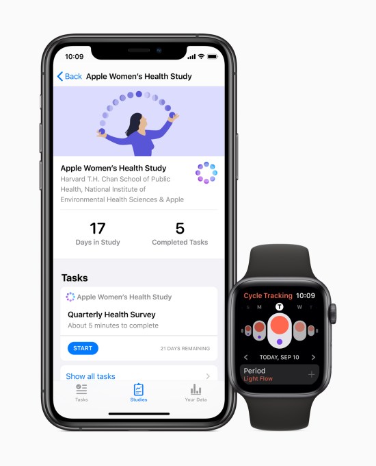 Among the first three studies is a women’s health study in partnership with the Harvard T.H. Chan School of Public Health and National Institute of Environmental Health Sciences. It aims to advance understanding of women’s menstrual cycles and their relationship to infertility, osteoporosis, menopause and polycystic ovary syndrome (PCOS). This will collect users’ cycle tracking logs from the Health app on the iPhone or the Cycle Tracking app on Apple Watch.