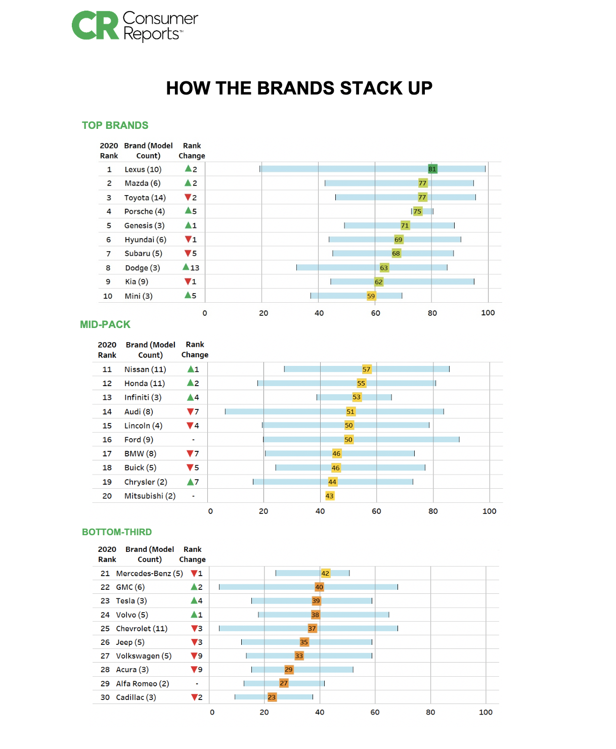 Cadillac came in last place. Audi, Acura and Volkswagen are among the brands that saw sharp drops, following the introduction of troublesome redesigned vehicles. Volkswagen, which is ranked 27th, dropped nine spots from last year due to reliability issues with the Atlas and Tiguan. The Consumer Reports survey noted that the two SUVs had problems with power equipment, in-car electronics and the emissions/fuel system.
