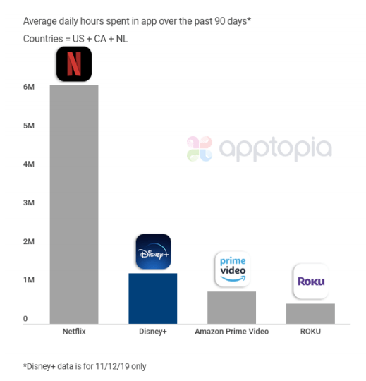 - Apptopia estimated Disney+ was downloaded 3.2 million times in its first 24 hours. The firm also estimated users collectively spent 1.3 million hours watching Disney+ on day one — ahead of Amazon Prime Video, but well behind Netflix.
