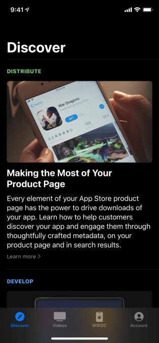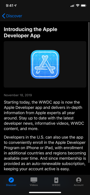 Instead, the app’s content is organized across four main sections: Discover, for finding developer information, news and updates; Videos, where you’ll find the videos the WWDC app once hosted; WWDC, for event attendees; and Account, where developers can manage their account and program membership.