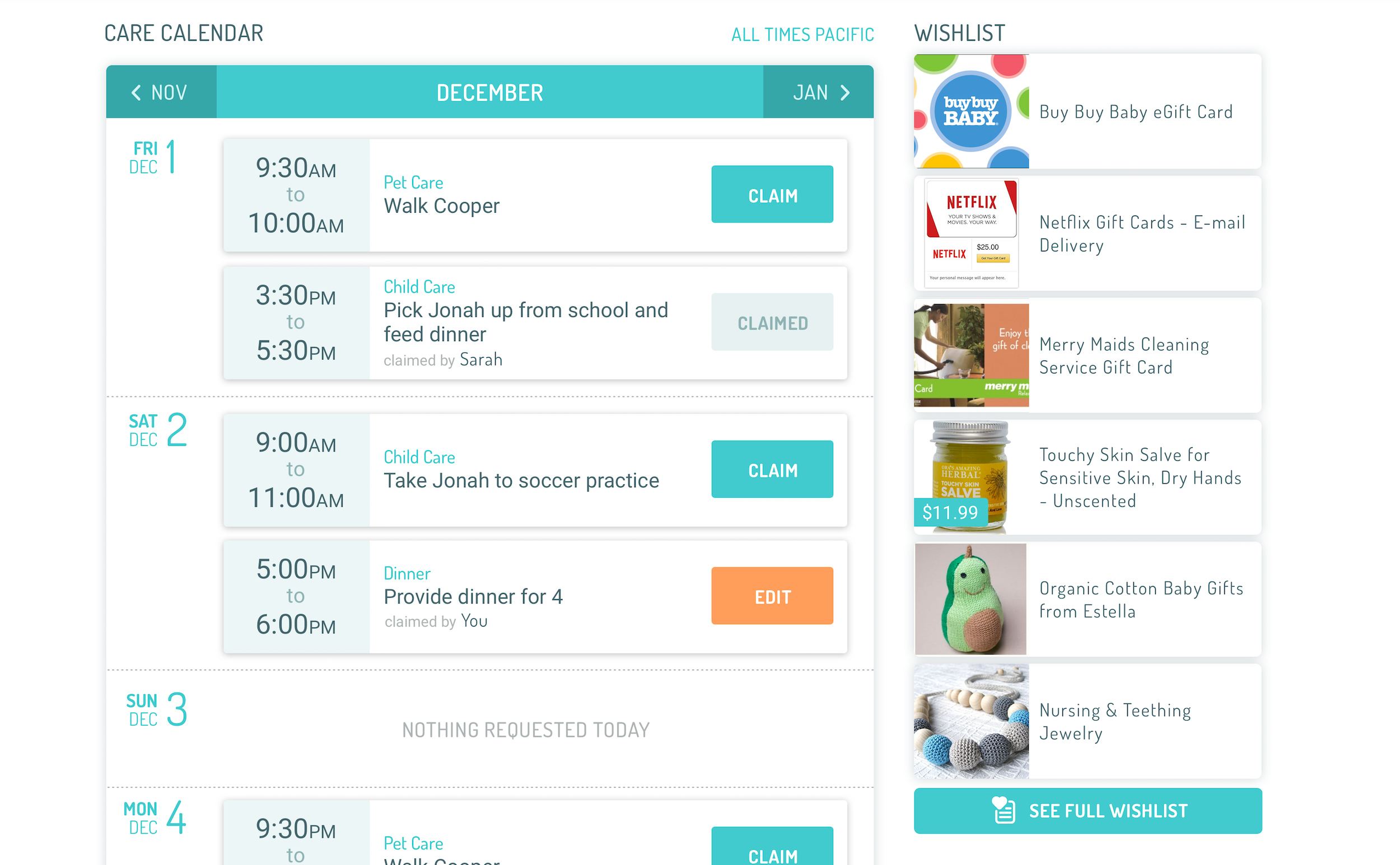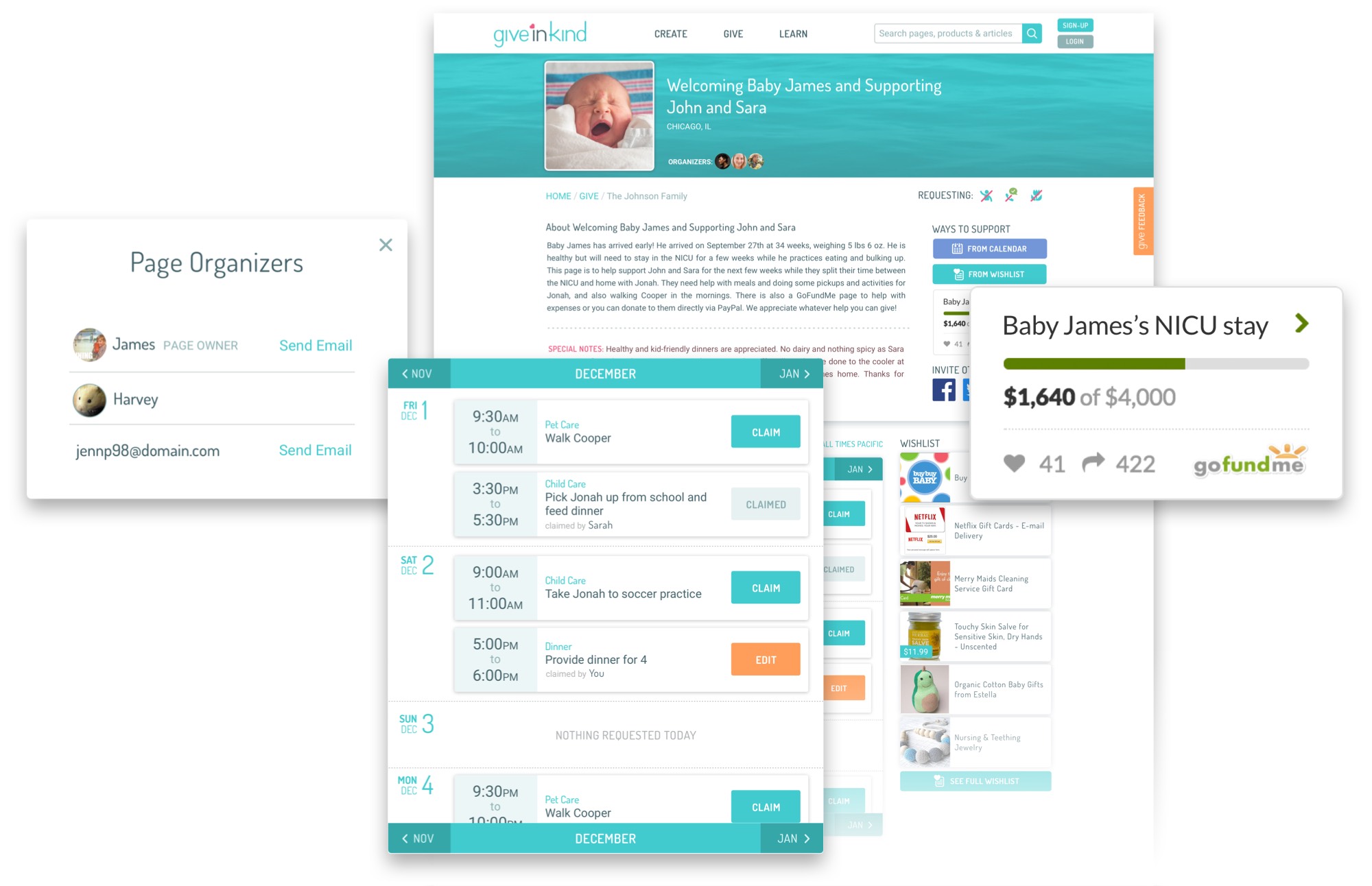 The idea with Give InKind is to provide a variety of options for helping someone out. Of course you can donate cash, but you can also buy specific items from wishlists, coordinate deliveries, set up recurring gifts (like diapers or gift boxes), or organize in-person help on a built-in calendar.