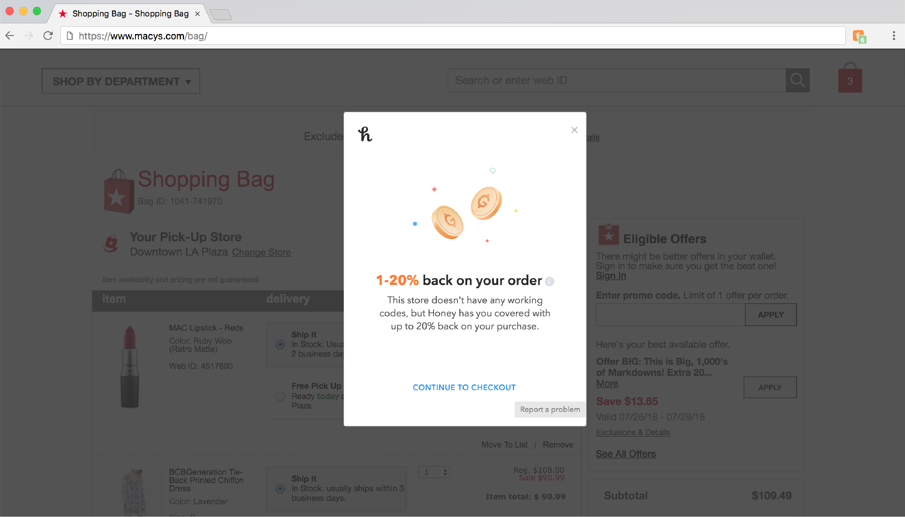 Originally only a web browser extension, Honey tracks sales and retailers’ promo codes, as a rival to RetailMeNot and others. What makes the extension so useful is that it automatically tries all the eligible promo codes for you during checkout then selects the one that provided the most savings and applies it on your behalf. This helps shoppers feel more comfortable with their purchases and reduces shopping cart abandonment.