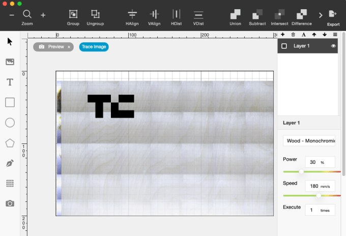 Beam Studio is super straightforward, but darn powerful for a free companion app. If you’re looking to cut out basic shapes, etch text or lay down some bezier curves, it can do it. Want to etch a picture of your dog into some wood to make a keychain? Just drop an image onto the work area, scale as desired, then move a slider to tweak the black/white threshold until it looks right. You can work in layers, setting up a raster layer to be etched and then a vector layer to cut it out immediately after.