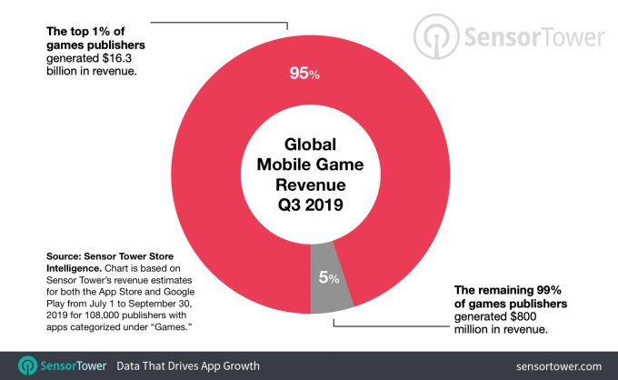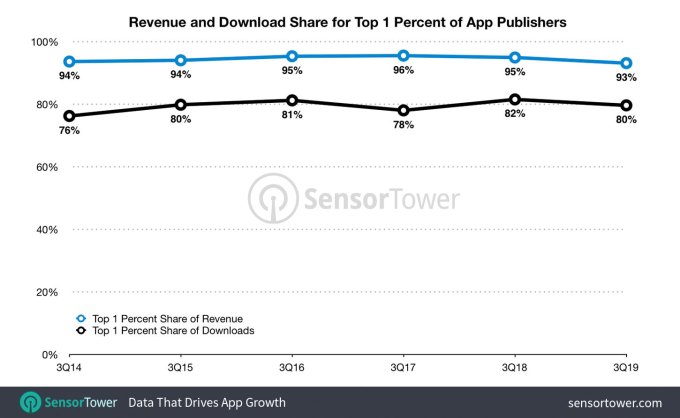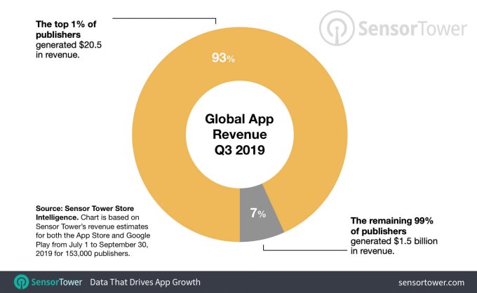 The current app store ecosystem doesn’t favor the indie developer. According to new data from Sensor Tower, the top 1% of publishers globally accounted for a whopping 80% of the total 29.6 billion app downloads in the third quarter of 2019. That means just 20%, or 6 billion, downloads are left for the rest of the publishers.