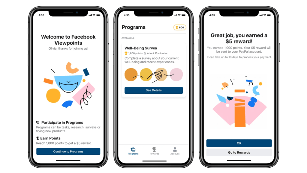 Facebook is launching a new market research, task, and product testing program that lets users earn money. Starting today, people in the US who are over 18 can download Viewpoints and participate in a well-being survey so Facebook can learn to “limit the negative impacts of social media and enhance the benefits.” Other opportunities include completing online chores on behalf of Facebook, or trying out new apps or devices ahead of launch so Facebook can refine them.