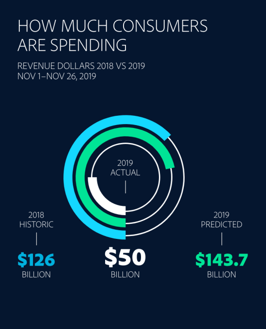 Based on this data, Adobe believes its earlier forecast of $143.7 billion spent during the full holiday shopping season (Nov.-Dec.) remains accurate. That estimate represents a 14.1% rise from a year ago, according to Adobe. In addition, the three biggest shopping days — Thanksgiving, Black Friday, and Cyber Monday — will also see increases, it says.