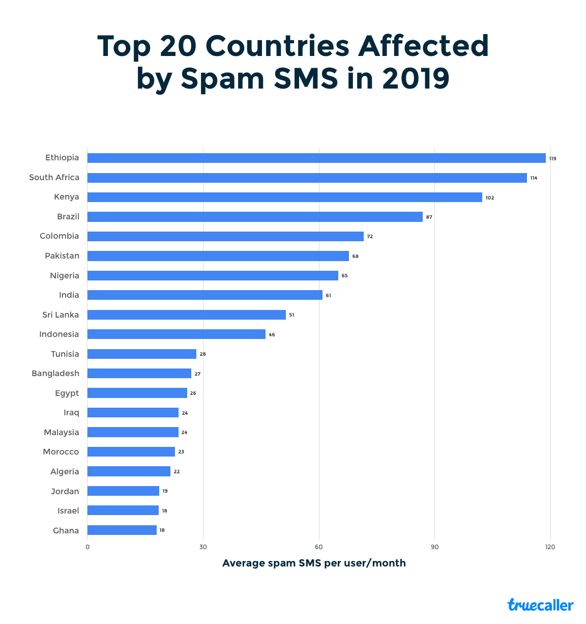 Truecaller’s report also noted that users worldwide received more than 8.6 billion spam texts this year. Below is a chart that looks at the markets that are most affected with spam SMSs.