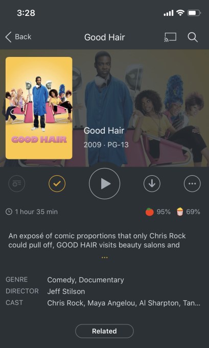 Meanwhile, clicking through to each title will show you details like genre, rating, year, length, description and even critic scores and audience ratings from Rotten Tomatoes, among other metadata. The titles will stream in 1080p and you can mark items as played, as you can with personal media.