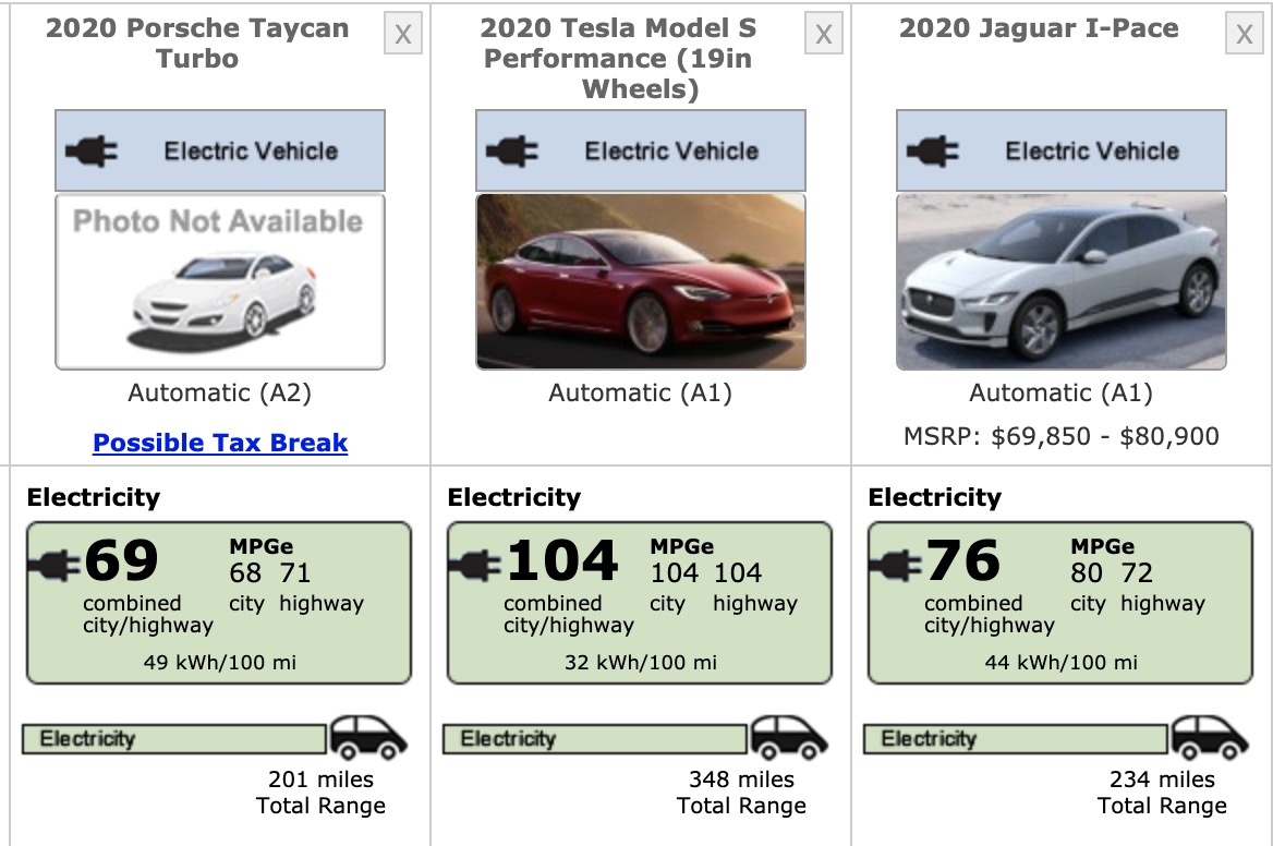 The biggest gulf is between the Taycan Turbo and the long-range version of the Model S, which has an EPA range of 373 miles. The performance version of the Model S has a range of 348 miles. It was also below the Jaguar I-Pace, an electric vehicle that launched in 2018. The EPA has given the Jaguar I-Pace an official estimated range of 234. However, the company recently said it was able to add another 12 miles of range to the vehicle through what it learned in the I-Pace racing series.