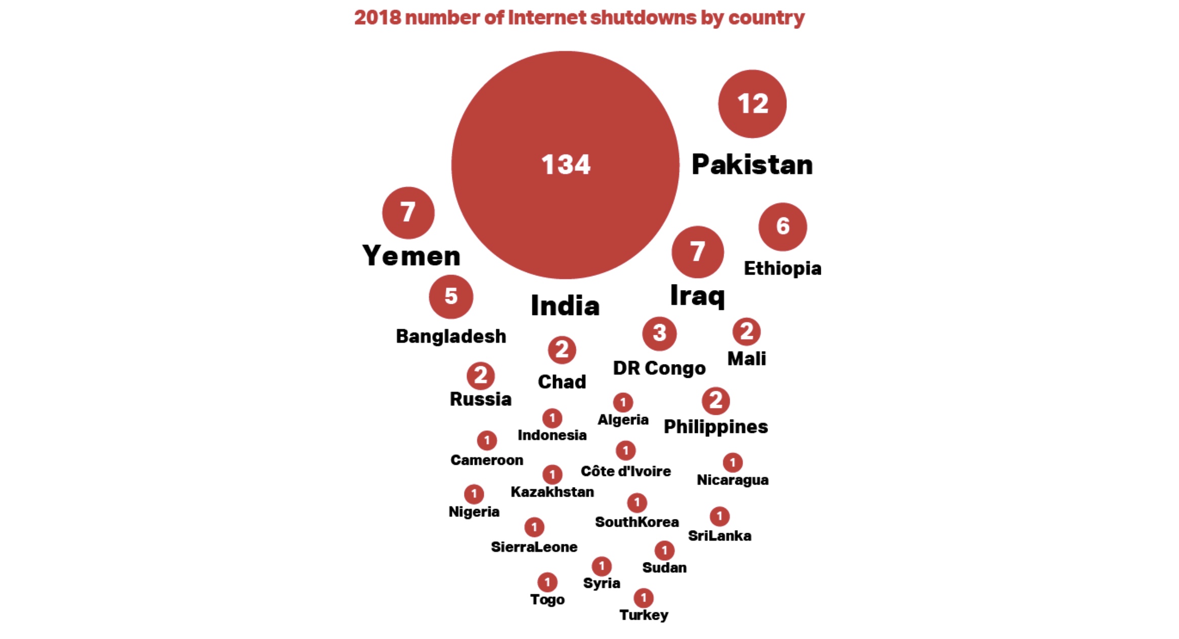 Access Now, a digital rights group, reported earlier this year that India alone had about 134 of 196 documented shutdowns in 2018. According to Internet Shutdowns, a service operated by New Delhi-based digital advocacy group Software Law and Freedom Centre, there have been about 91 documented cases of internet shutdowns in India this year.