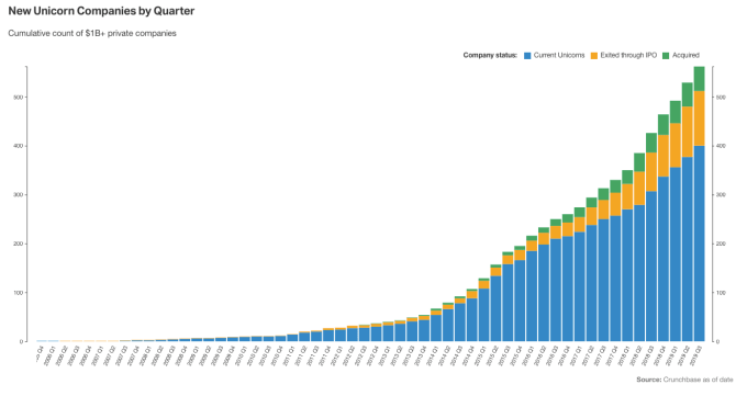 In its most recent update for Q3 2019, the same dataset indicates that there are 400 unexited unicorns, 112 that have gone public and 50 that have been sold.