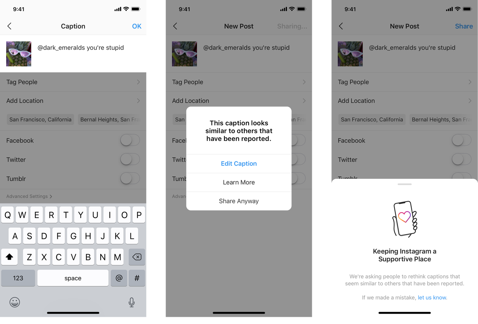 Instagram is trying to beef up its safety practices across the board. Today it began alerting users that the caption they’re about to post on a photo or video could be offensive or seen as bullying, offering them a chance to edit the text before they post it. Instagram started doing the same for comments earlier this year. Instagram is also starting to ask new users their age to make sure they’re 13 or older, which I’d previously written it needed to add since it was otherwise feigning ignorance to dodge Child Online Privacy Protection Act violation fines.
