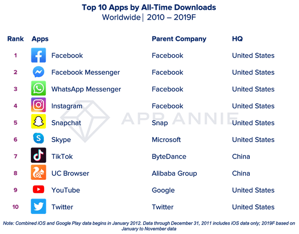 Making a good case for its monopoly status, Facebook didn’t just operate four of the most-downloaded (non-game) apps of the past 10 years — it runs the top four most-downloaded apps. In order, that’s Facebook, Messenger, WhatsApp and Instagram.