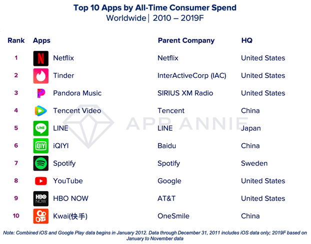 And though dating app Tinder was the most profitable app this year, Netflix was the No. 1 app by all-time consumer spend over the past decade.