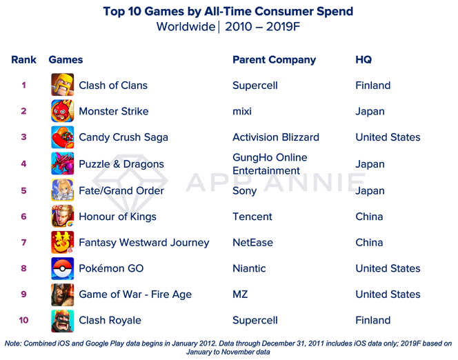 The rest of the list was rounded out by Puzzle & Dragons by GungHo Online Entertainment, Fate/Grand Order by Sony, Honour of Kings by Tencent, Fantasy Westward Journey by NetEase, Pokémon GO by Niantic, Game of War – Fire Age by MZ and Clash Royale by Supercell.