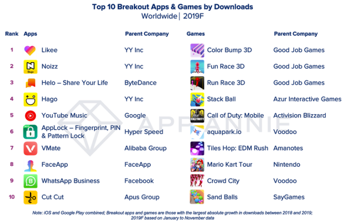 App Annie also took a look at a new category of apps that it’s calling the “breakout” apps of the year. These are those that saw the largest absolute growth in downloads or consumer spending between 2018 and 2019. On this list, the No. 7 most-downloaded app of the year, Likee, from YY Inc., becomes the No. 1 “breakout” app of the year, followed by YY Inc.’s Noizz and Helo. Meanwhile, Indian users drove the adoption of social gaming app Hago at No. 4, which is also popular with Gen Z users in Indonesia.