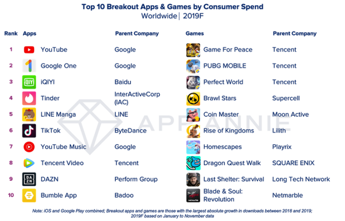 Breakout apps by consumer spending included YouTube, iQIYI, DAZN and Tencent Video — similar to the top 10 list.