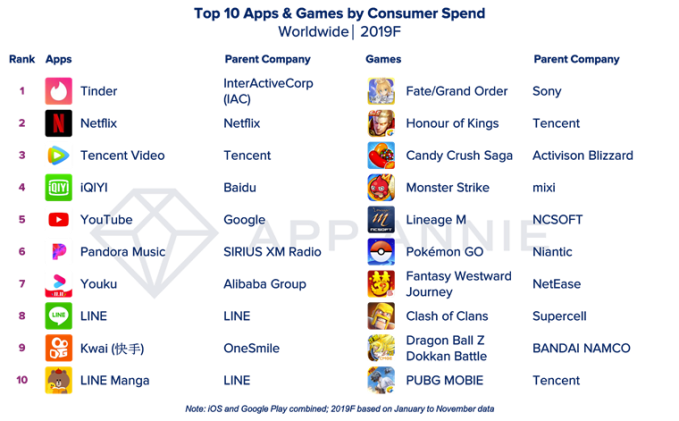 This year, Tinder switched places with Netflix for the No. 1 spot on this chart — last year, it was the other way around. HBO NOW, which saw a surge in spending thanks to “Game of Thrones,” also fell out of the top chart this year, allowing LINE Manga to take its spot. Tencent Video and iQIYI have the same positions as 2018, while YouTube grew from No. 7 to No. 5, and Pandora slipped from No. 5 to No. 6 compared with last year.