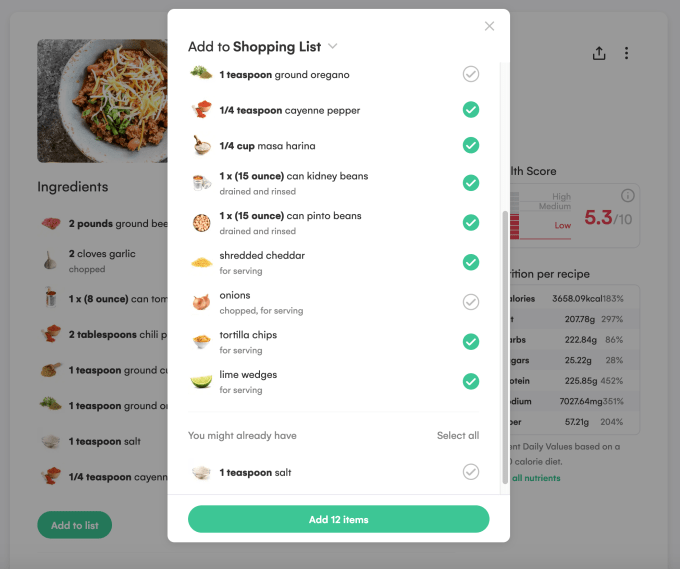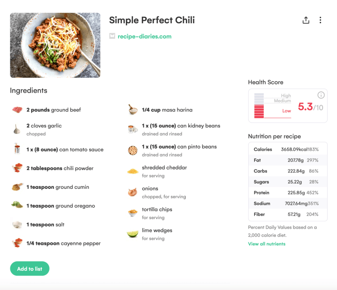 But there are advantages that come with taking the extra few minutes on the recipe entry. Beyond just the organizational aspects, Whisk also brings its smart technology to the meal planning process. Once added, every ingredient is identified with a small photo icon as a visual reference and Whisk calculates the recipe’s nutritional aspects and gives it a “health score.”