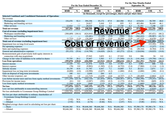 Ucommune is therefore a hybrid co-working and services business. Neither piece of the whole is attractive from a margin perspective. For example, the company’s $58.7 million in co-working revenue earned during the first nine months of 2019 was nearly entirely offset by lease costs ($49.6 million) alone, before the company staffed and otherwise managed the locations in question.