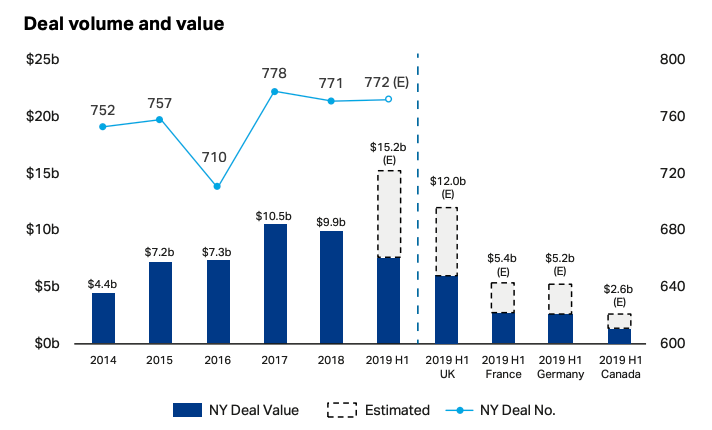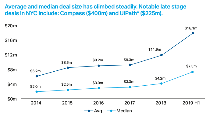 White Star’s report details record-breaking figures for NYC’s current year. Off of effectively flat deal volume (New York City sees around 775 venture deals per year at the moment, or a little more than two per day), the overgrown town should set record venture dollar volume in 2019.