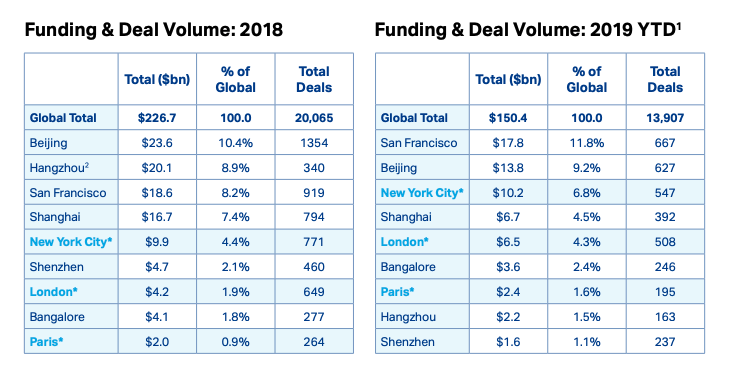 The YTD data in the right table ends September 21, 2019. So, before Q4 2019 even began, New York City had surpassed its full-year 2018 venture capital dollar volume. That’s a huge increase. (Which shows up in the percentage tables, of course, though I’d argue that it’s more important to note the decline in China’s venture capital results from 2018 to 2019 than it is to note that New York City’s jump up the chart.)