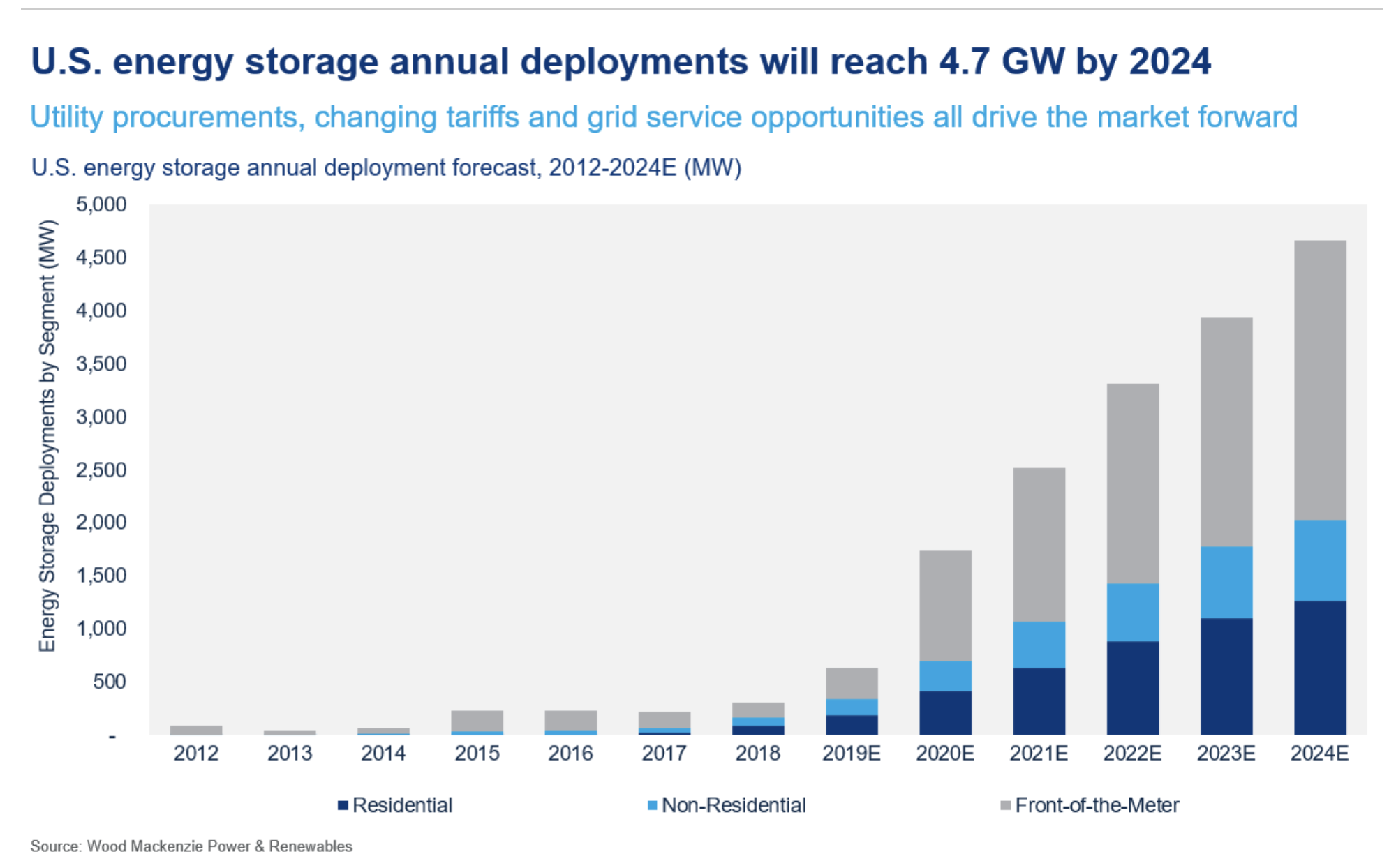 Estimates from the Energy Storage Association and the analyst firm Wood Mckenzie indicate that there’s going to be a huge surge in energy storage projects over the next four years. By 2024, energy storage projects will hit 4.7 gigawatts by 2024 and be worth roughly $5.3 billion, according to Wood McKenzie Energy & Research.