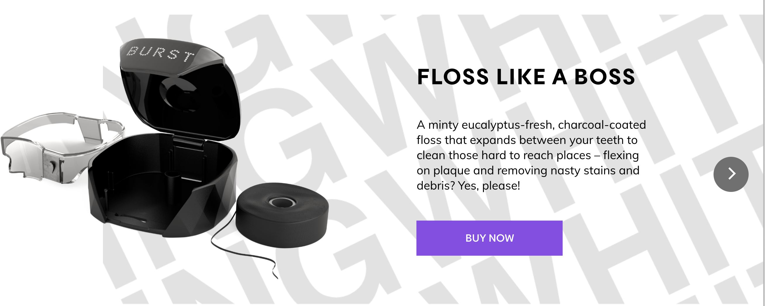 The new product is a $12.99 mint-eucalyptus-flavored, charcoal-coated dental floss that expands between teeth. Burst’s floss comes in a case for replacement bobbins, which can be delivered to a customer’s door for $6.99 per month.