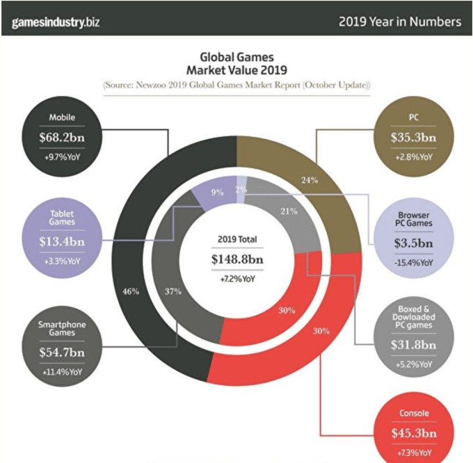 According to a year-end report by GamesIndustry.biz, mobile gaming grew 9.7% year-over-year in 2019 to reach a market value of $68.2 billion. The gaming market as a whole was worth $148.8 billion, the report said. Smartphone games were the biggest piece of this figure, at $54.7 billion, compared with $13.4 billion for tablet games. That means smartphone games are still bigger than PC, browser PC games, boxed and downloaded PC games, and console games.