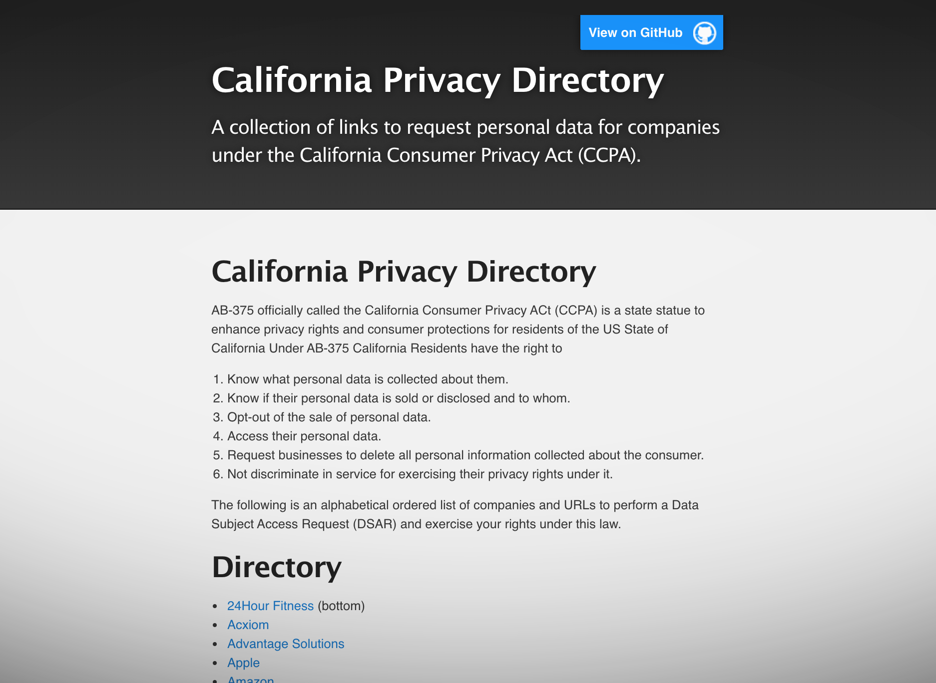 Damian Finol created a running directory of company pages that allow California residents to opt-out of their data being sold and request their information. The directory is updated frequently, and so far includes banks, retail giants, airlines, car rental services, gaming giants and cell companies — to name a few.