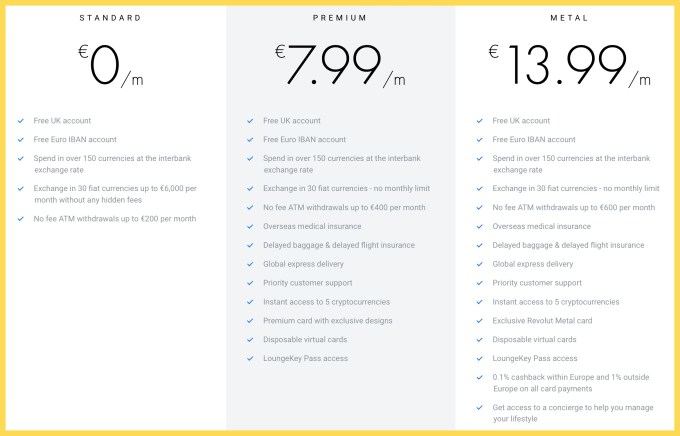 For example, Revolut offers premium accounts for €7.99 per month with higher limits, some insurance benefits that you’d expect from a premium card and access to advanced features, such as cryptocurrencies and disposable virtual cards. There’s a super premium product for €13.99 called Metal with a metal card design, cashback on card payments and access to a concierge feature.