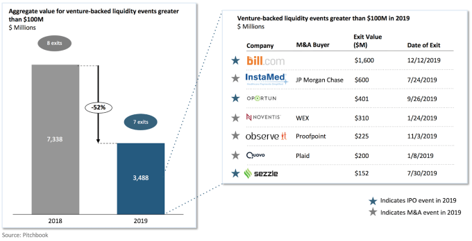 Liquidity has proven scarcer. None of the companies that were unicorns at the end of last year exited this year. As a result, liquidity contracted compared to 2018, both by number of exits and realized value. We see two reasons companies are staying private longer. First, late-stage founders have continued to find cheap late-stage capital readily available in the private markets.