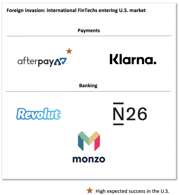 - Competition from international players will be massively disruptive to the U.S.- born major fintech players. The banking entrants will spend lots of money but not gain much traction. Afterpay will emerge as a behemoth and one of the most disruptive foreign fintech players to have entered the U.S. market.