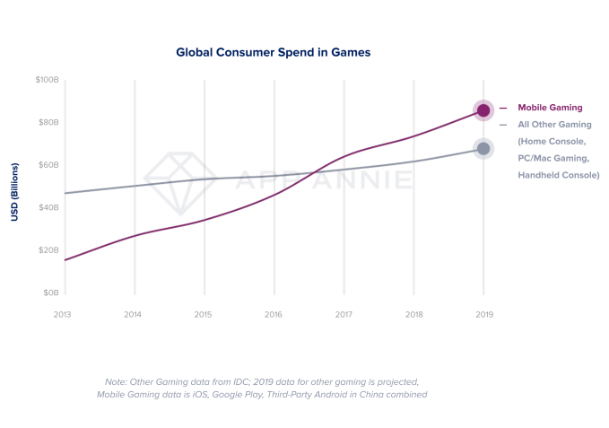 Consumer spending in mobile gaming was 2.4x that of Mac/PC gaming, and 2.9x more than game consoles. In 2019, mobile gaming saw 25% more spending than all other gaming, and is on track to surpass $100 billion across all app stores by next year.