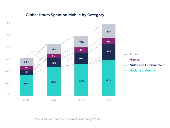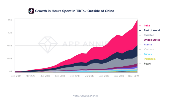 TikTok was given special attention, given its rapid growth last year. Time spent in the short-form video app grew 210% year-over-year in 2019 globally. Even though eight out of every 10 minutes spent in TikTok were by users in China, the app’s usage skyrocketed in other markets as well, App Annie said.