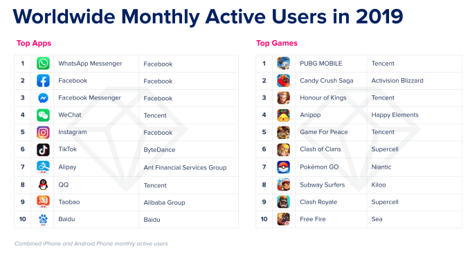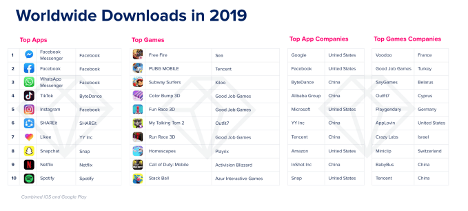 App Annie also compiled its own list of the top apps of 2019 by active users, downloads and revenue. Facebook apps still led by engagement, with WhatsApp, Facebook and Messenger in the top three spots and Instagram as No. 5. And they maintained similar positions by downloads, only swapping places with one another.