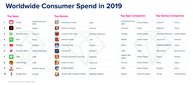 In particular, dating apps like Tinder and video apps like Netflix and Tencent Video topped 2019’s consumer spend charts, thanks to subscription revenue.