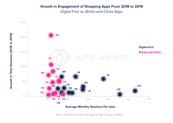 One bigger highlight was that digital-first shopping apps still had 3.2x more average monthly sessions per user compared with apps from traditional brick-and-mortar retailers (dubbed “bricks-and-clicks” apps in the report).