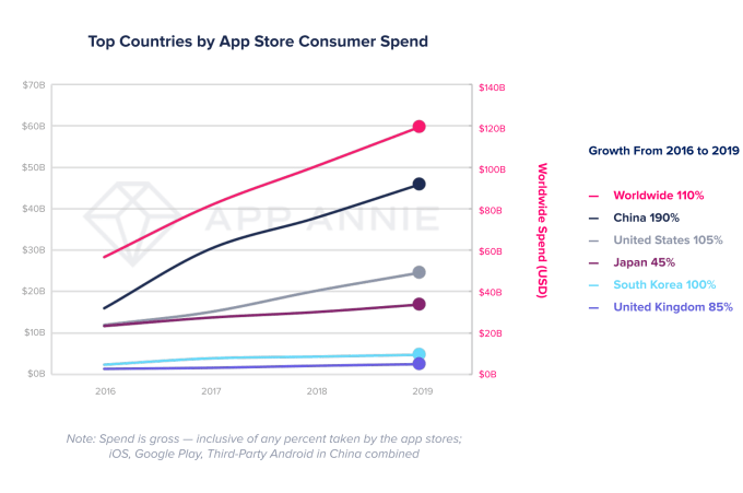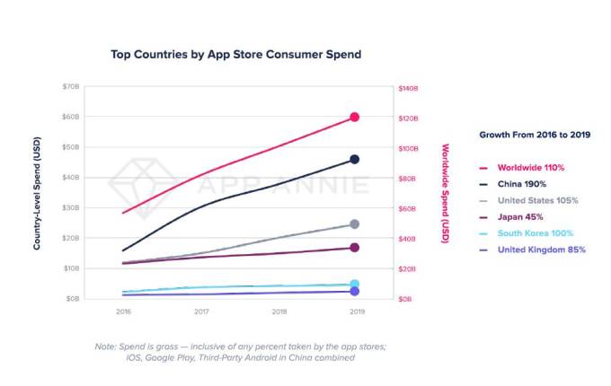 Mature markets, including the U.S., Japan, South Korea and the U.K. are helping to fuel consumer spending across both games and subscriptions, App Annie found. But China remains the largest market by far, accounting for 40% of global spend.